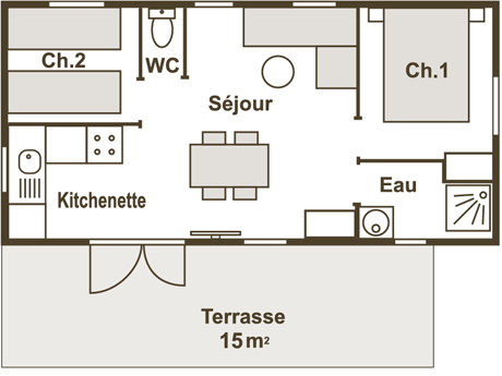 Each mobile home includes two bedrooms, a living area with an integrated kitchen, a bathroom, separate toilets, and a terrace where you can enjoy your meals or relax with a book.