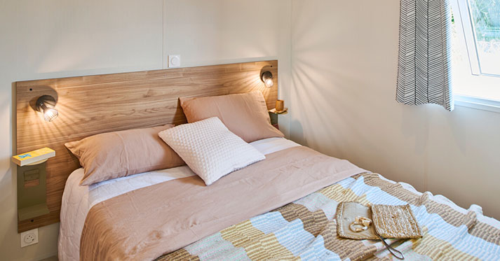 Chaque mobil home est constitué de deux chambres, un séjour avec un coin cuisine intégré, une salle de bain, des toilettes séparées et une terrasse où vous pourrez vous installer pour prendre vos repas ou bouquiner.